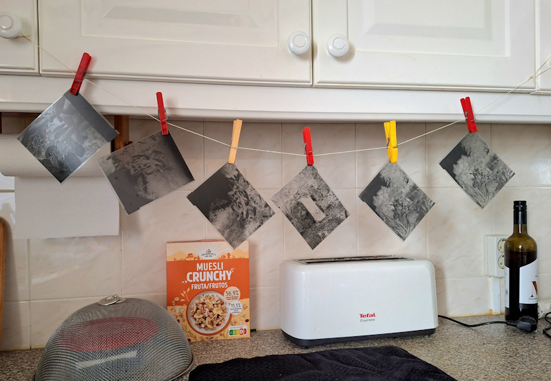 A quick drying line in the kitchen. There were a couple of schoolboy errors on two sheets, forgetting to close the shutter etc.